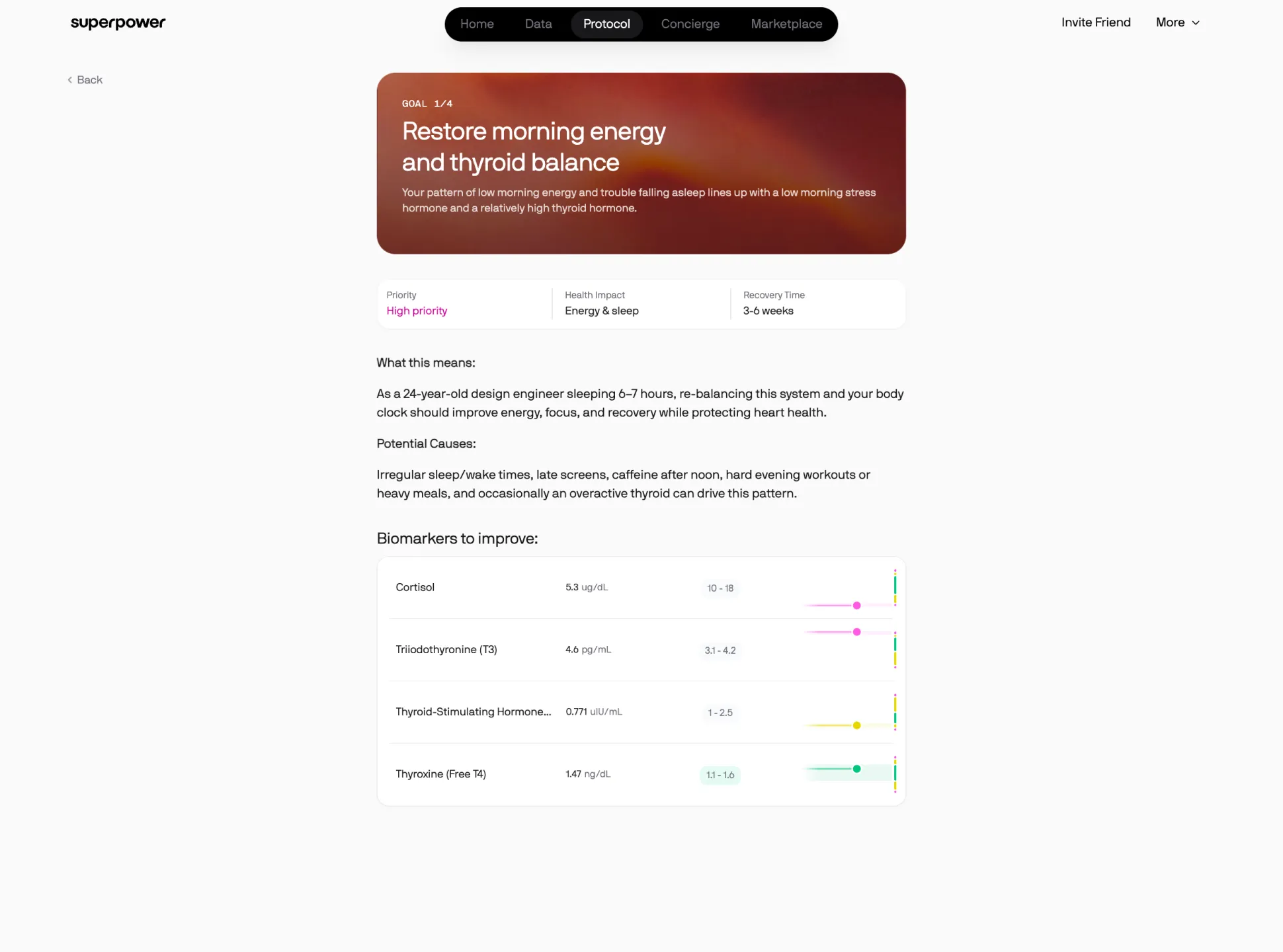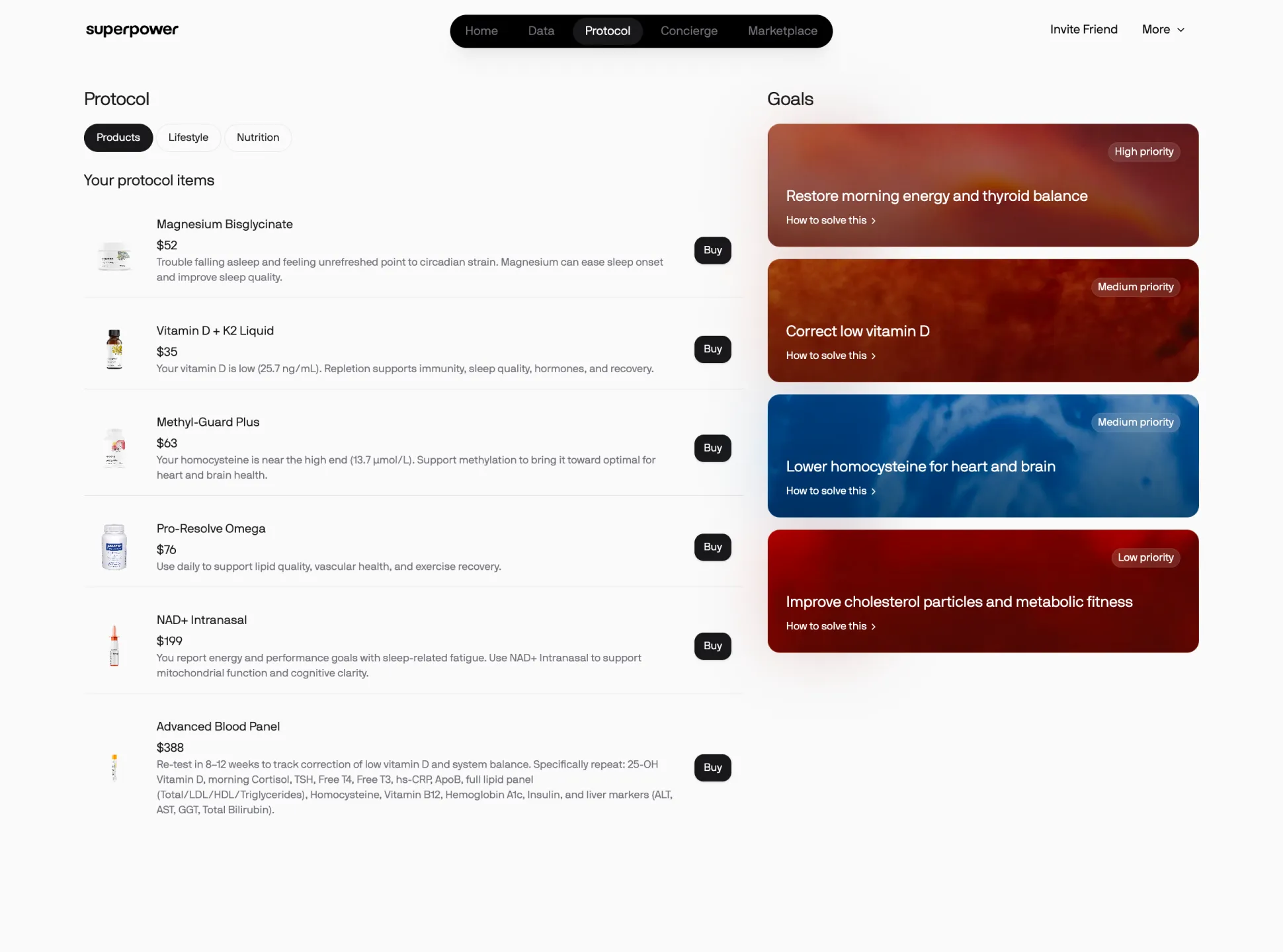 The platform guides users through actionable health protocols, making it easy to understand what steps to take next based on their unique biomarker results.